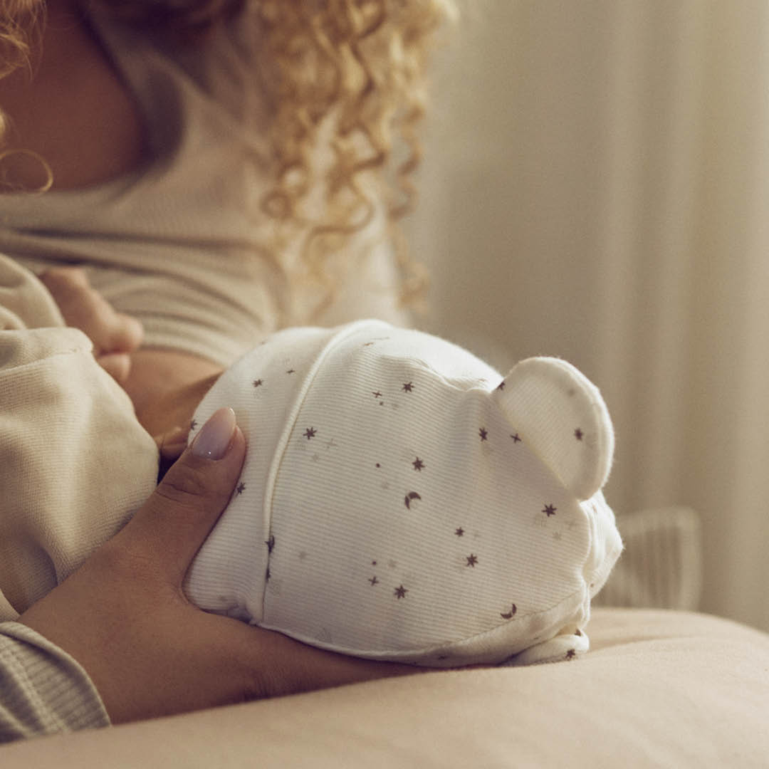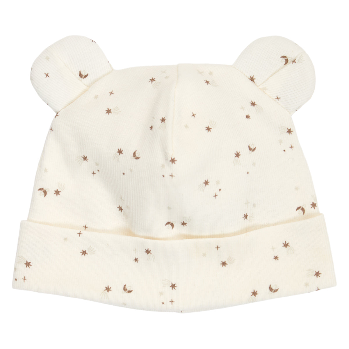 Huen er med en foldet kant og søde bamse ører på toppen.