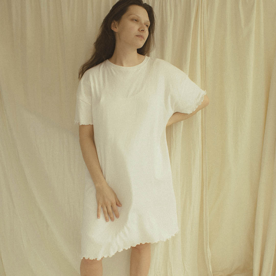 Kjolen er fint afsluttet med en overlocket rynke-detalje ved ærmer og bund.