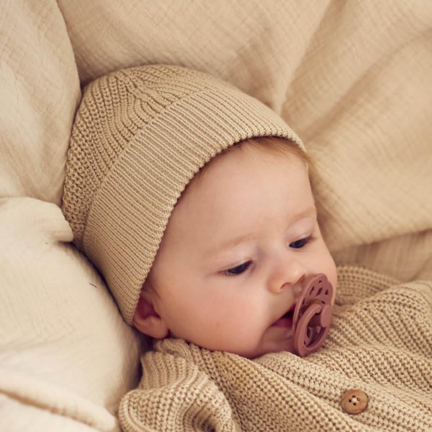 Sød babyhue / beanie i dejlig grov strikket kvalitet
