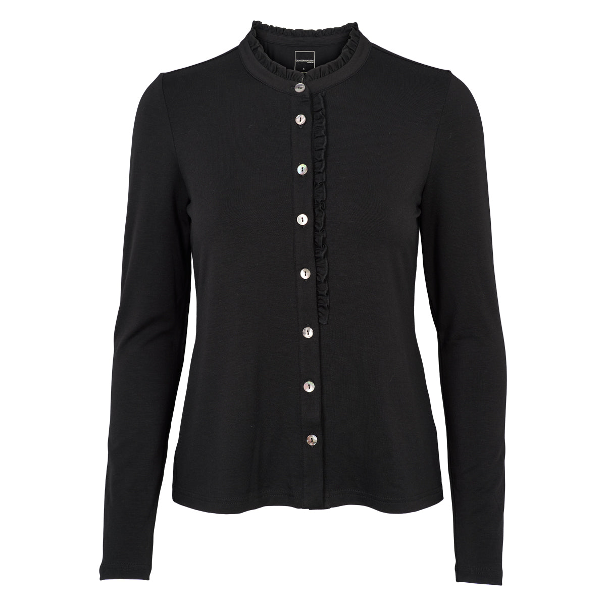 Blusen er med lange ærmer og en halvhøj krave med dekorative flæser på kanten.