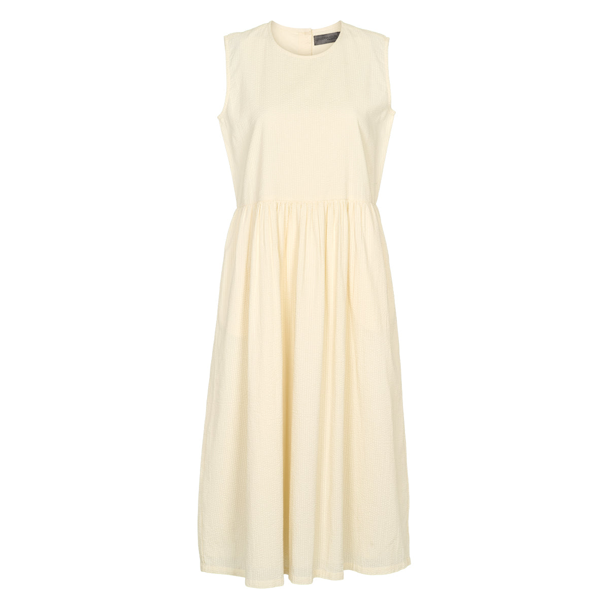 Kjolen er knæ-lang og har en mere tætsiddende overdel med knap lukning fortil. Kjolen er ærmeløs.