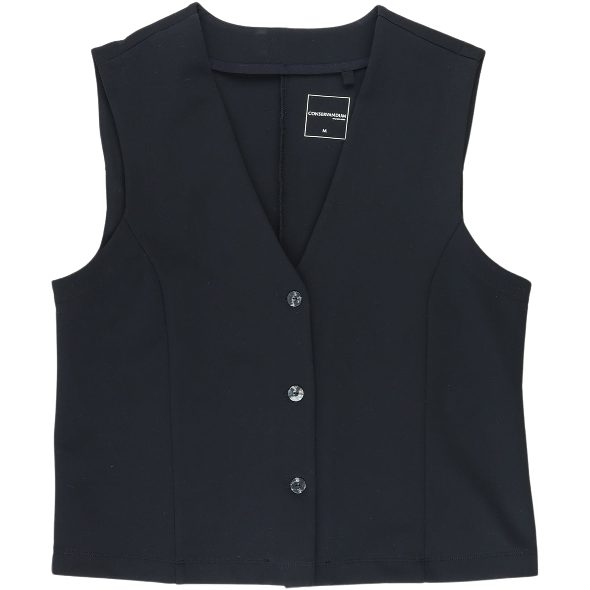 Vesten er uden foer og lommer og lukkes med knapper fortil.