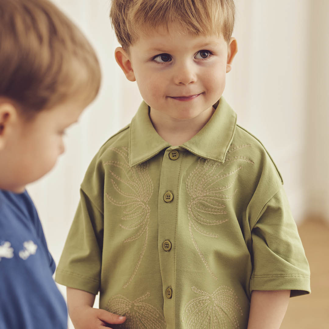 Skjorten er udført i blød strik med naturinspireret mønster.