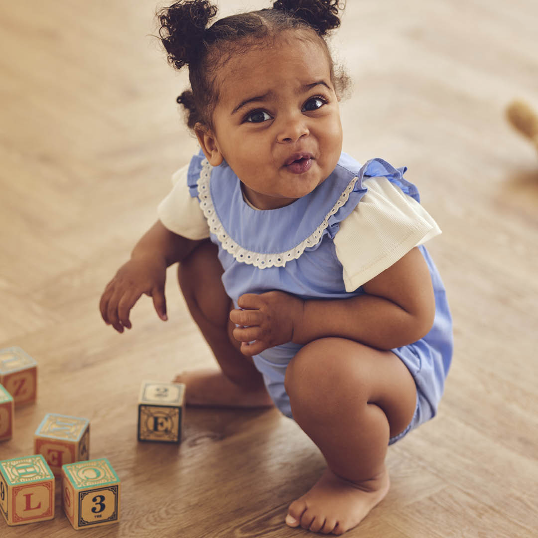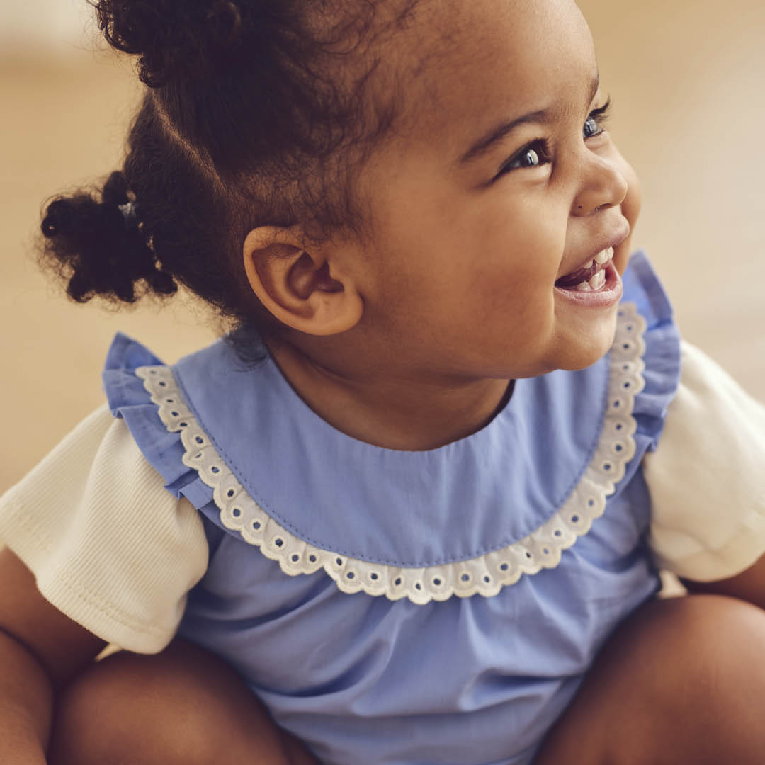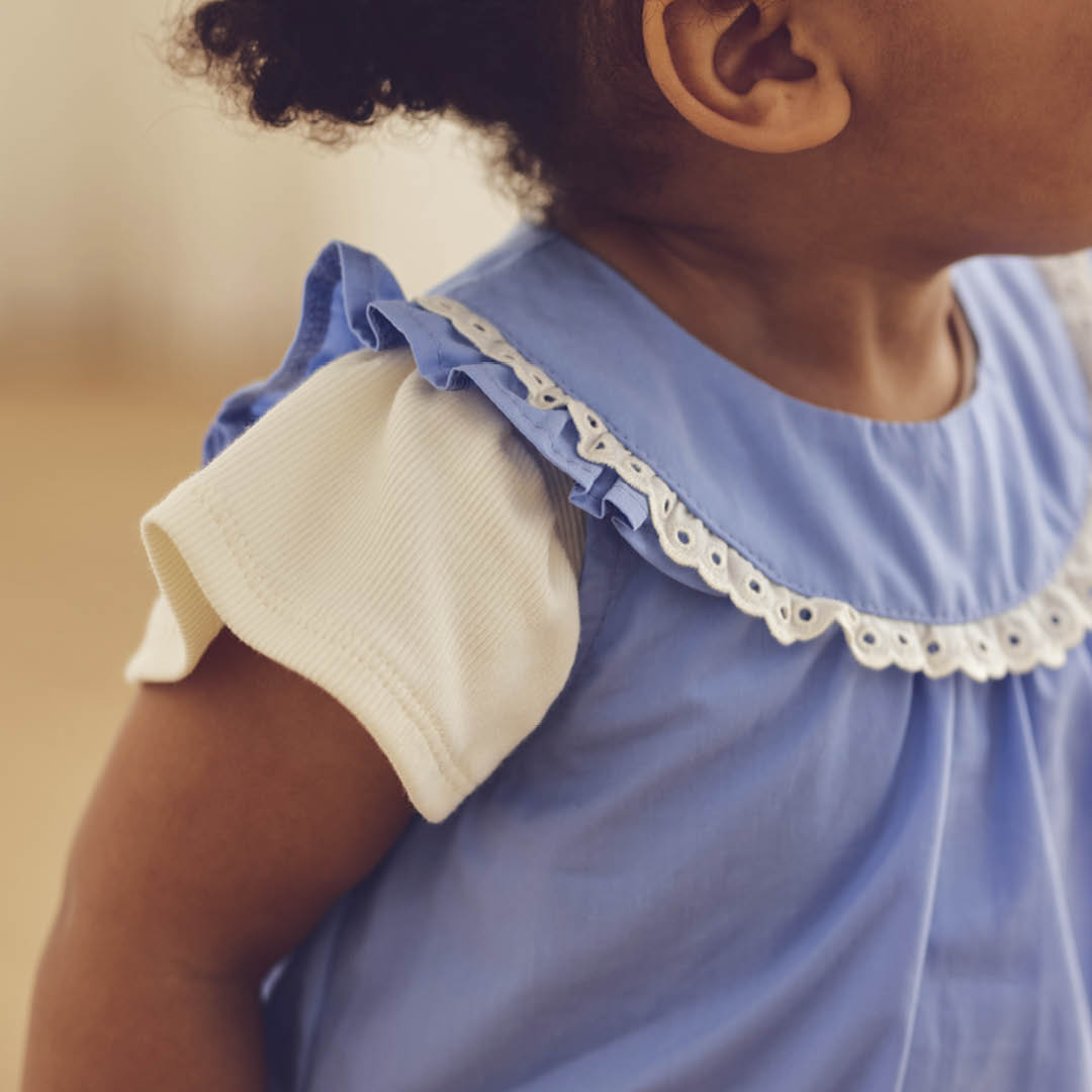 Der er en sød og dekorativ bomulds blonde i kraven.
