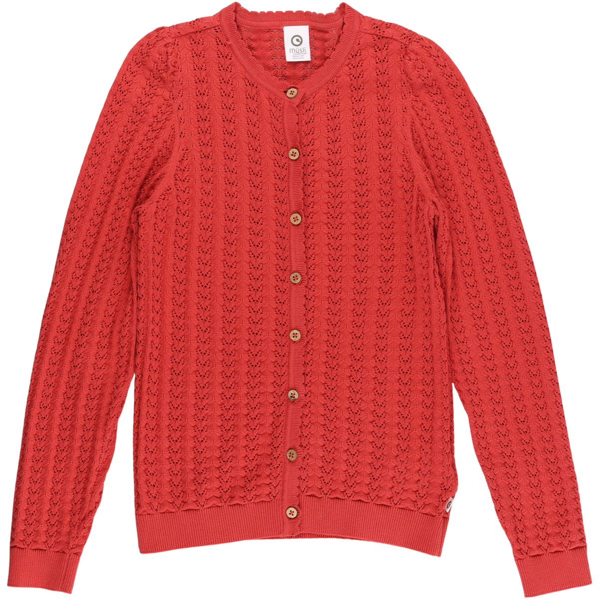 Super sød og smuk strikket cardigan med flot hulmønster i strikken. Cardiganen lukkes med knapper fortil, knapperne er lavet af kokosnød 100 % bomulds strik med mønsterMaterialer