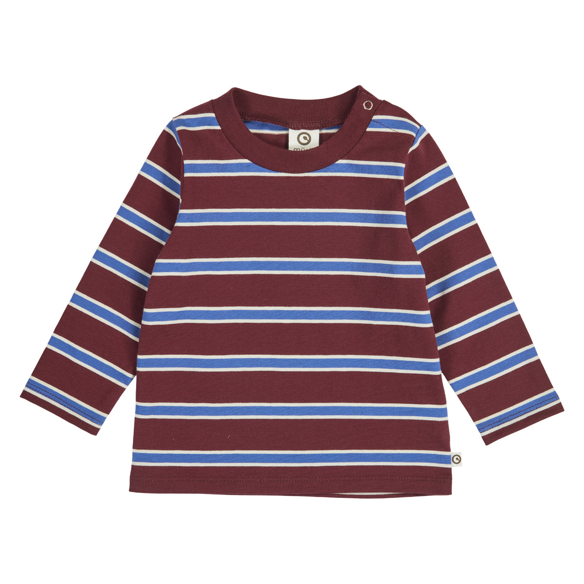 Blusen har smarte brede tværgående striber i blå, mørkrød og creme farver.