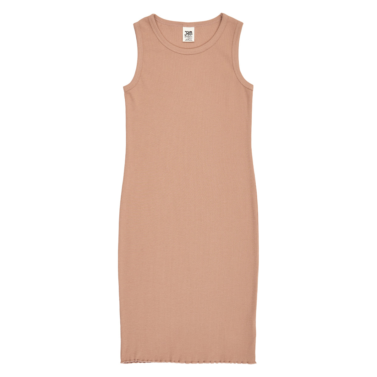 Super fin rib ærmeløs kjole med flæse/rynke detalje i afslutning af kjolen.