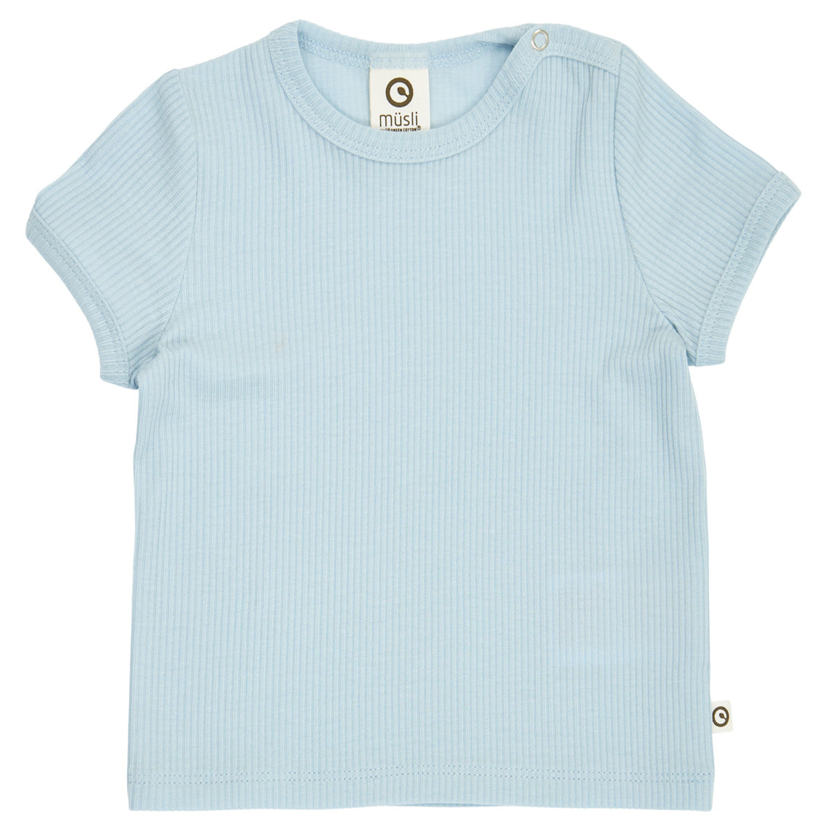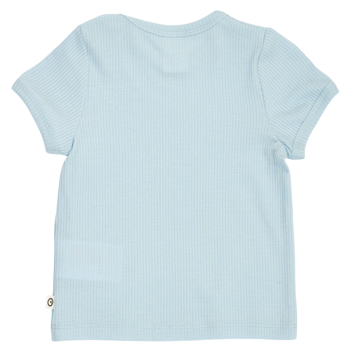 T-shirten har korte ærmer og åbnes i halsåbningen med tryk knapper.