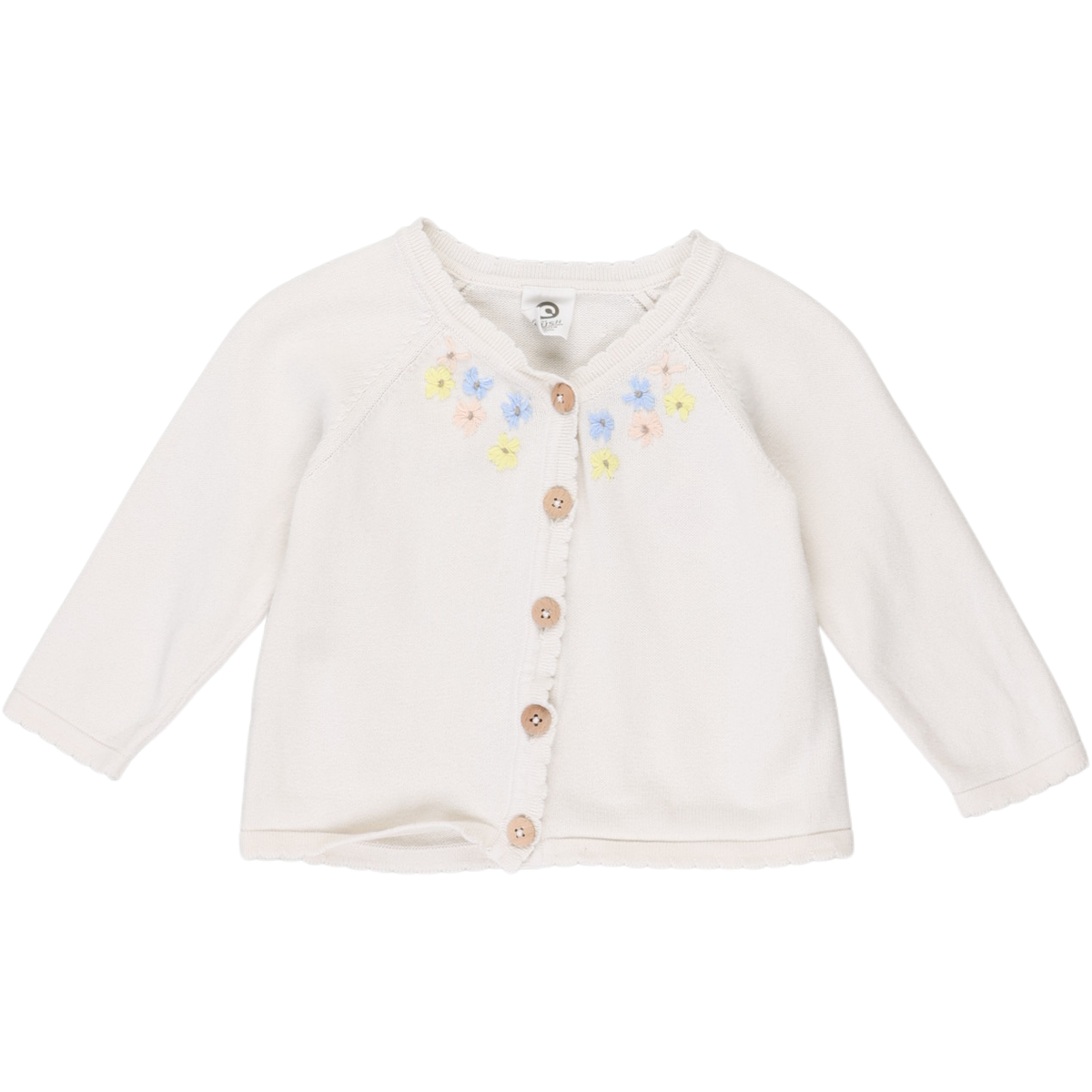 Skøn strik cardigan i blød bomuld og med små fine blomster på fronten.