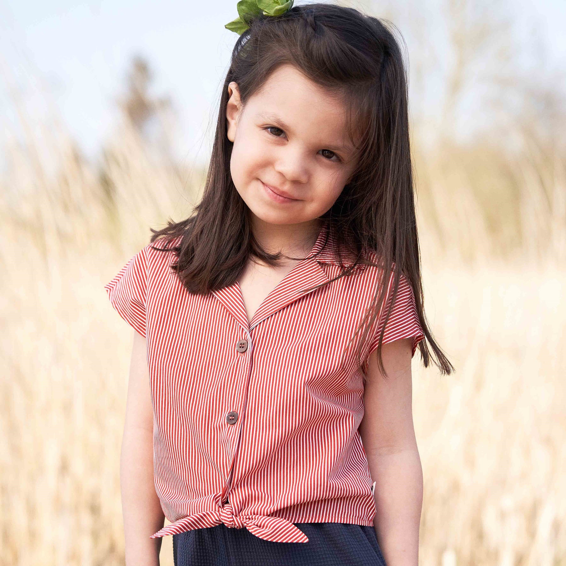 Smart sommerskjorte i kort cropped model med bindebånd fortil.
