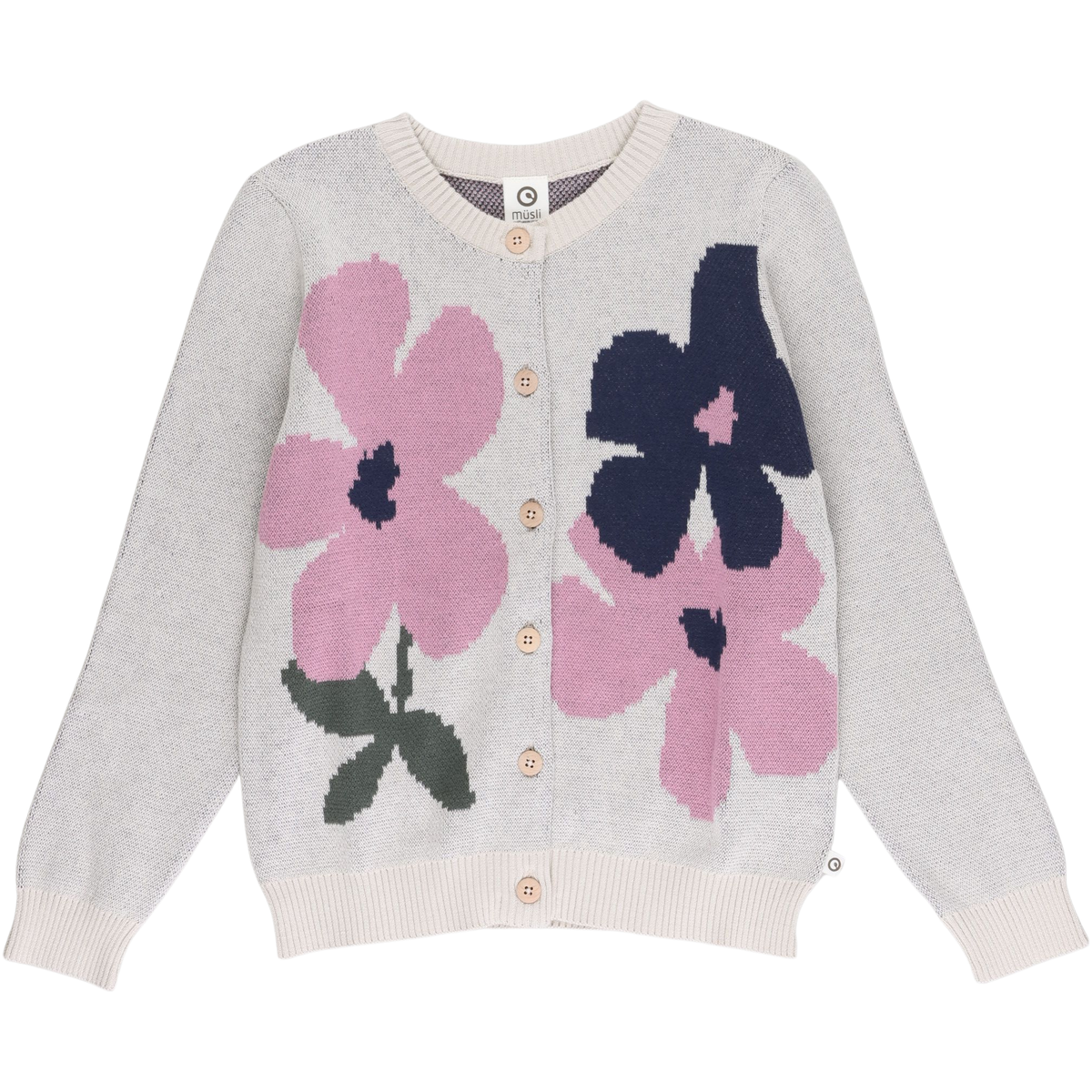 Smuk og feminin strik cardigan med store broderede blomster på brystet.