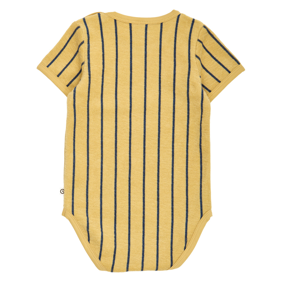 Super fin body med korte ærmer og med søde mørkeblå striber på en sandfarvet baggrund.