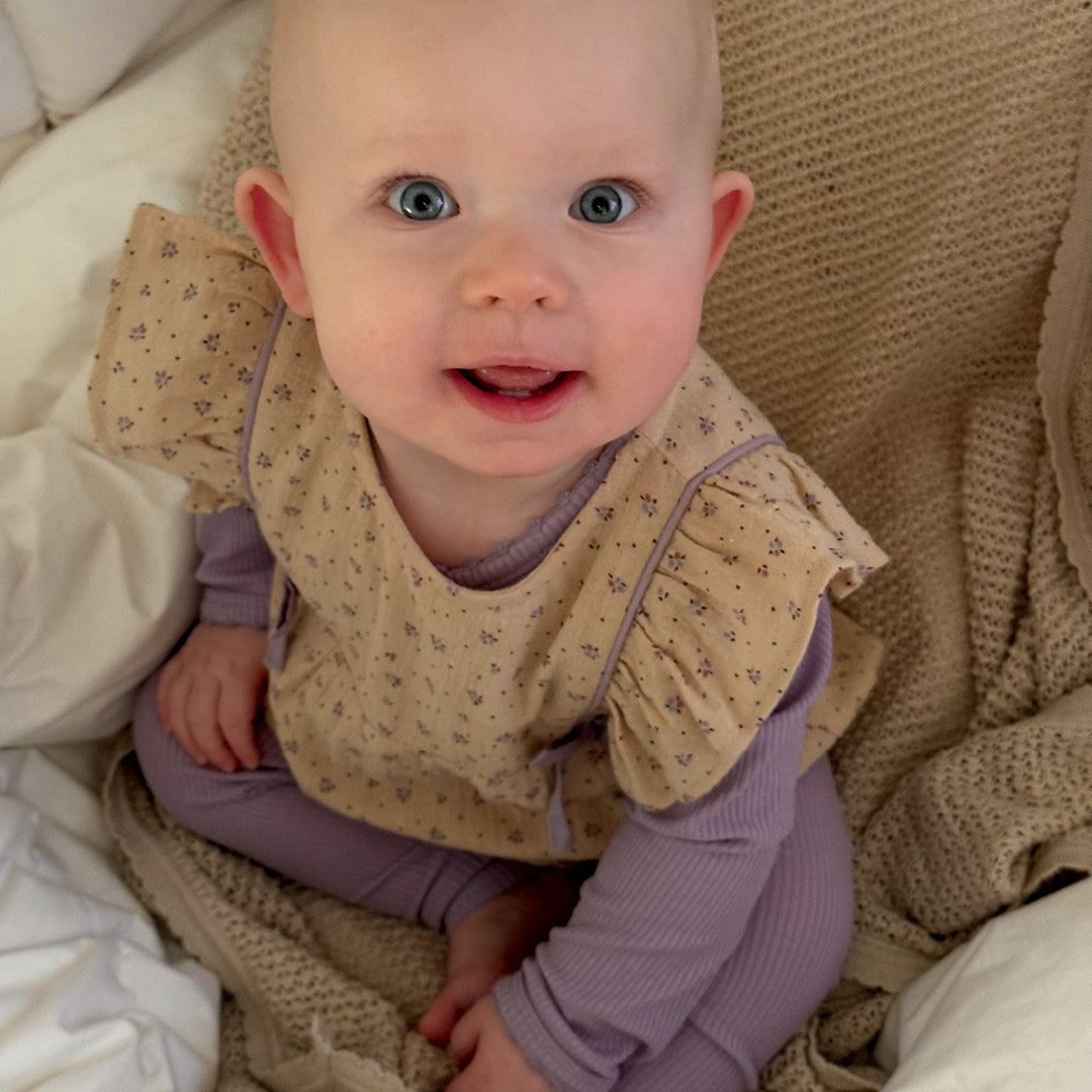 Super skøn body med flæser på ærmerne og sløjfer på fronten.