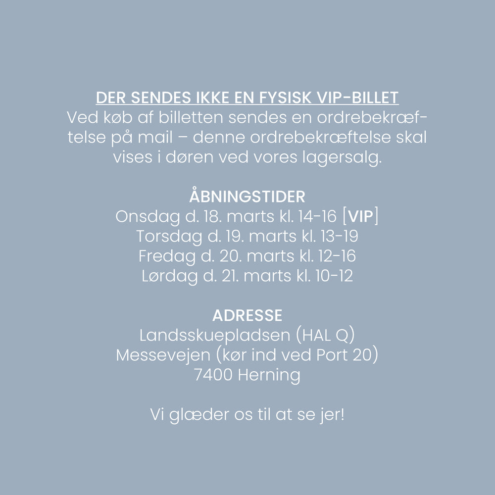 VIP billet til vores lagersalg gældende onsdag den 18. marts 2026 kl. 14.00-16.00.